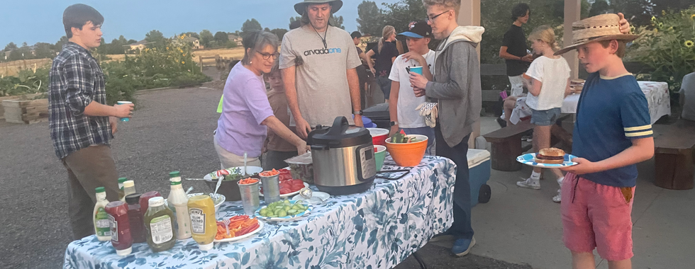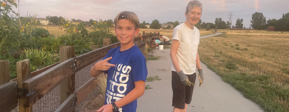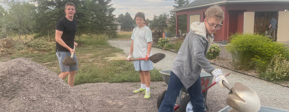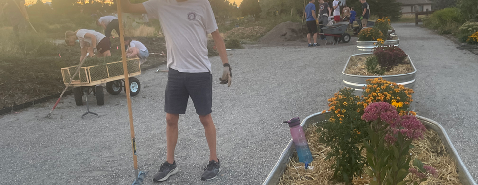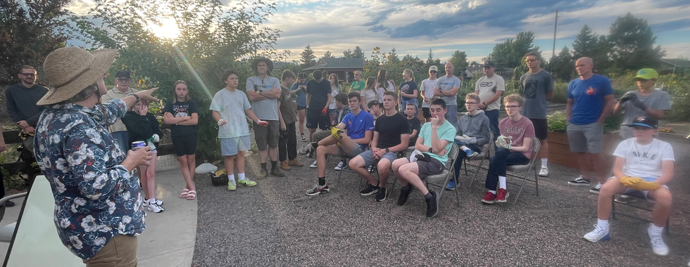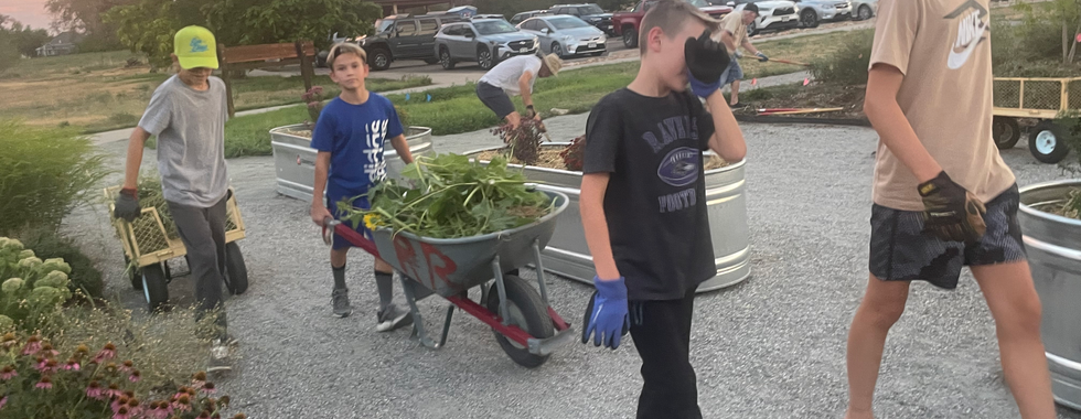 Wed Aug 28, Community Volunteer Day: We had a wonderful community volunteer work day with Jason Anderson's Church of Jesus Christ of Latter-Day Saints working with Rose Roots gardeners for one of our busiest work parties of the season! The pollinator garden, community spaces and west side were weeded and watered, gravel was spread, compost was turned, and fun was had! Thank you to garden leader Erin Newton for shopping for the grub and community member Joanne Leibowitz for grilling the goodies. Thank you to the Rose Roots Leadership Team for guiding work teams and especially to Jason's Youth Group for their hard work beautifying our very special community space!
